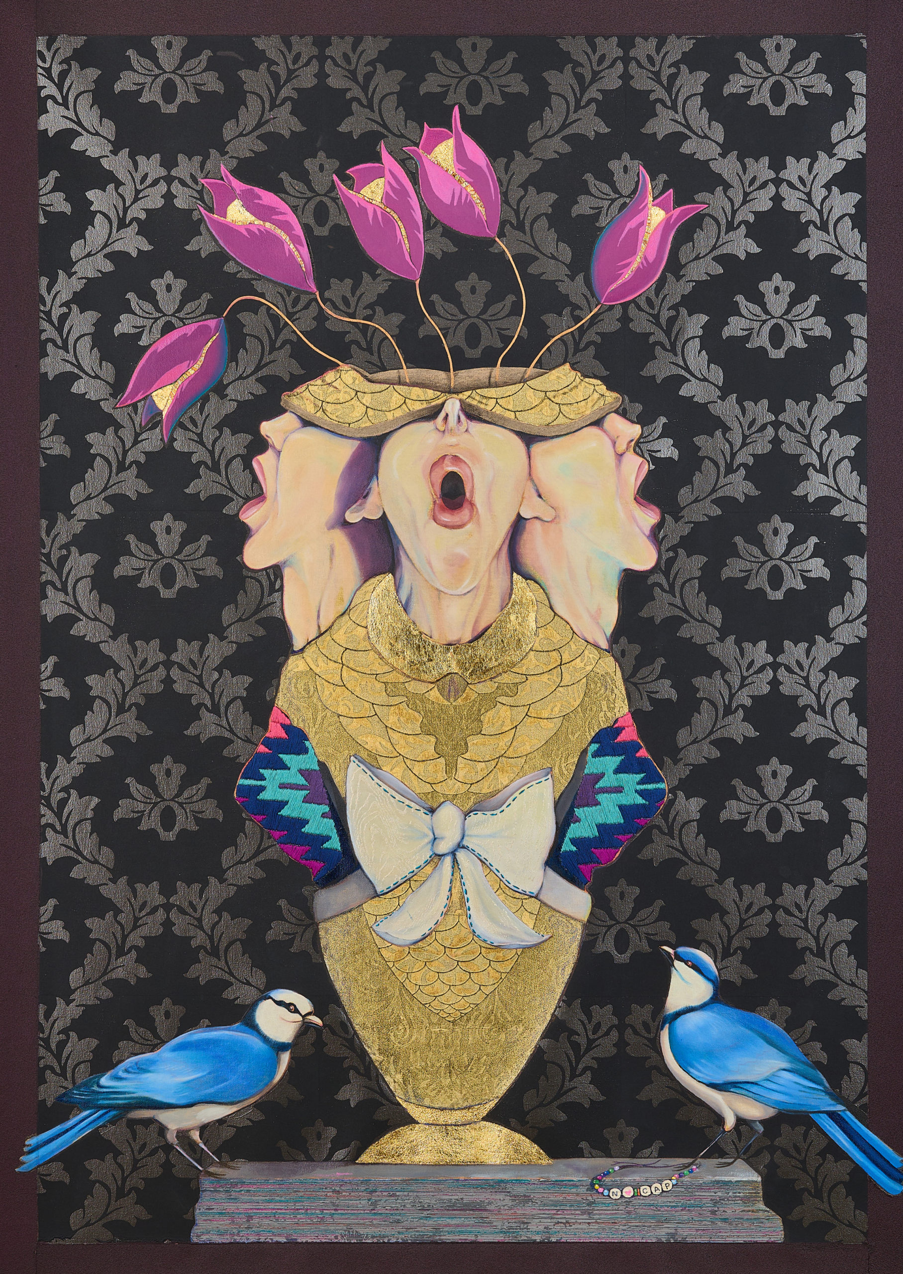 Perhaps the Chorus of the series; Birds of a Feather presents a wicked display of neo-classical elegance. A stately, decorative vase sits as the centerpiece, perhaps suggesting high-society refinement and “superficial” beauty. The background pattern functions as a rhythmic, graphic echo of the foreground—Knight’s humorous yet sophisticated play on the idea of a “record” or a frozen moment in time. This decorative repetition lures the viewer into a sense of order, stability, and historical nostalgia, making the work feel at home within the canon of traditional ornament. Reality emerges from the vessel’s design itself, which houses a single entity fractured into three faces in a silent yell. This is the visual manifestation of the “Prisoners of our own device.” It critiques the digital struggle of maintaining multiple personas, where the line between the authentic self and the curated avatar has been erased until the “real” you is indistinguishable. The faces are literally becoming part of the ornament, suggesting a “slippery slope” where we can succumb to our own materialism and superficiality. At the base of the pedestal, a beaded “NO CAP” bracelet sits as a stark yet humorous reminder of the search for truth in a filtered world. Amidst this psychological entrapment, the birds remain the only agents of freedom and truth; one stares back at the audience, a silent witness gesturing for us to check our own realities before we, too, become embedded in the pattern.